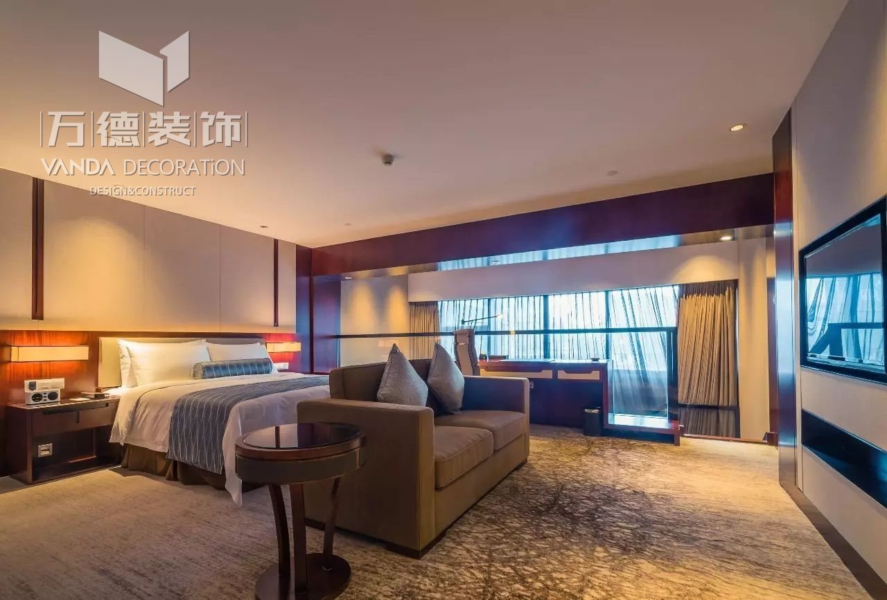 两江假日酒店是极具现代主义风格的建筑,从灯光到色彩,从材料到布局,设计师坚持为现代人创造一份属于自己的都市之美,享受平和、宁静的体验。干净精细的黑色线性金属与大面积的米黄色木纹石材形成鲜明对比并相得益彰,在灯光的照映下石材与金属显得富有光泽而通透,柔和而具有质感的空间感受传达出一种华贵和典雅的气质。